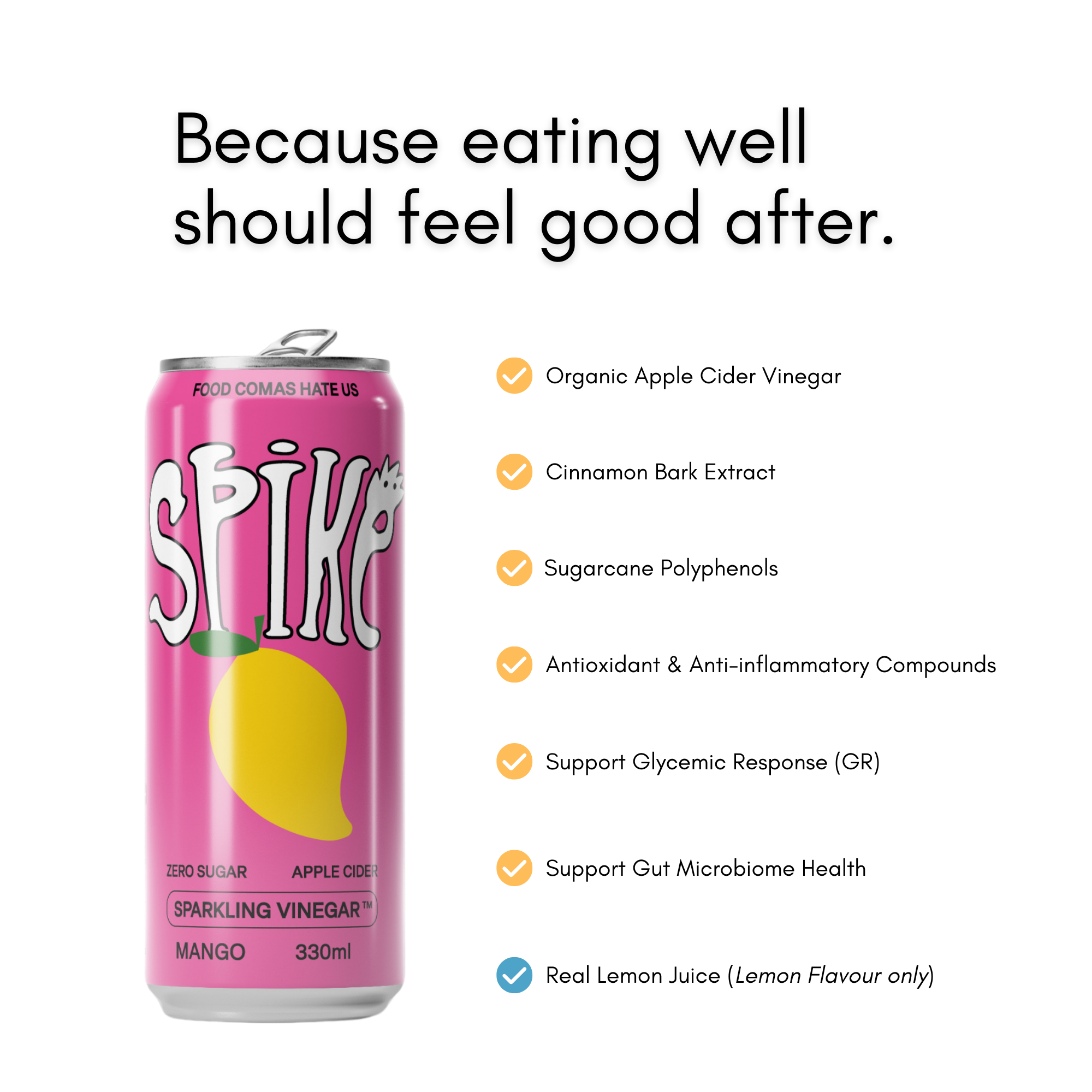 One can of spike can replace vinegar shots, kombucha, regular soft drinks, and post-meal supplements aimed at digestion and blood sugar support. Instead of mixing powders or chasing trends, you get functional ingredients — like acetic acid, cinnamon, and polyphenols — in a refreshing, ready-to-drink soda. Finally function you can actually feel!